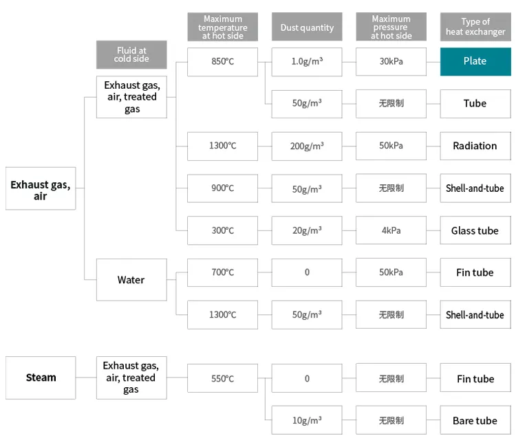 Este producto está diseñado para la recuperación de calor de escape entre gases, con una temperatura de entrada de liberación de calor convencional de hasta 800°C y una salida calentada de 500°C. Para aplicaciones de alta temperatura de flujo paralelo, la entrada de liberación de calor puede alcanzar 850°C. La tasa de transferencia de calor es de 30-40 kcal/m²·h·°C, la presión máxima es de 5000 mmAq, con todas las placas sirviendo como superficies de transferencia de calor y espaciado ajustable.
